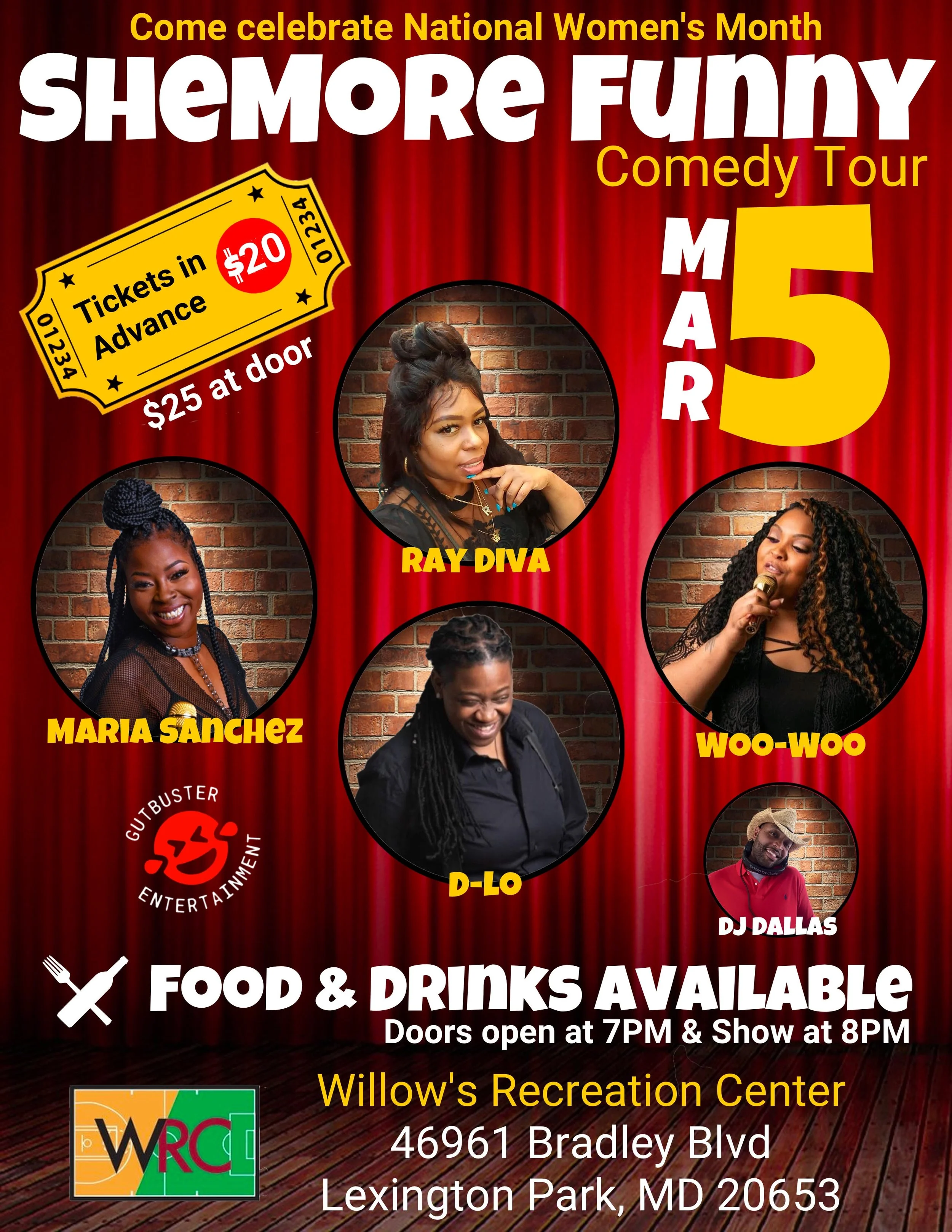 Shemore Funny Comedy Tour at Willow’s Recreation Center Saturday, March 5, 2022 7:00 PM 10:00 PM Willow's Recreation Center 46961 Bradley Boulevard Lexington Park, MD, 20653 United States (map) Google Calendar ICS Get Tickets Here